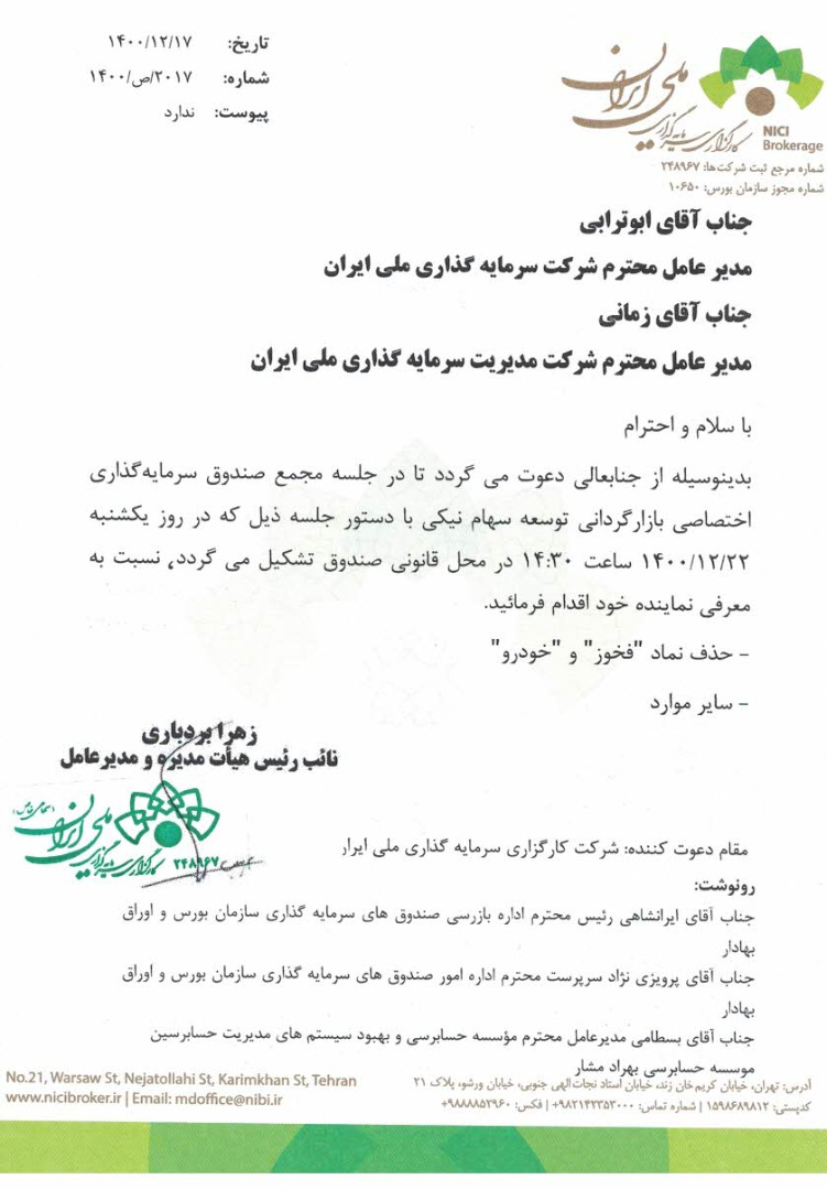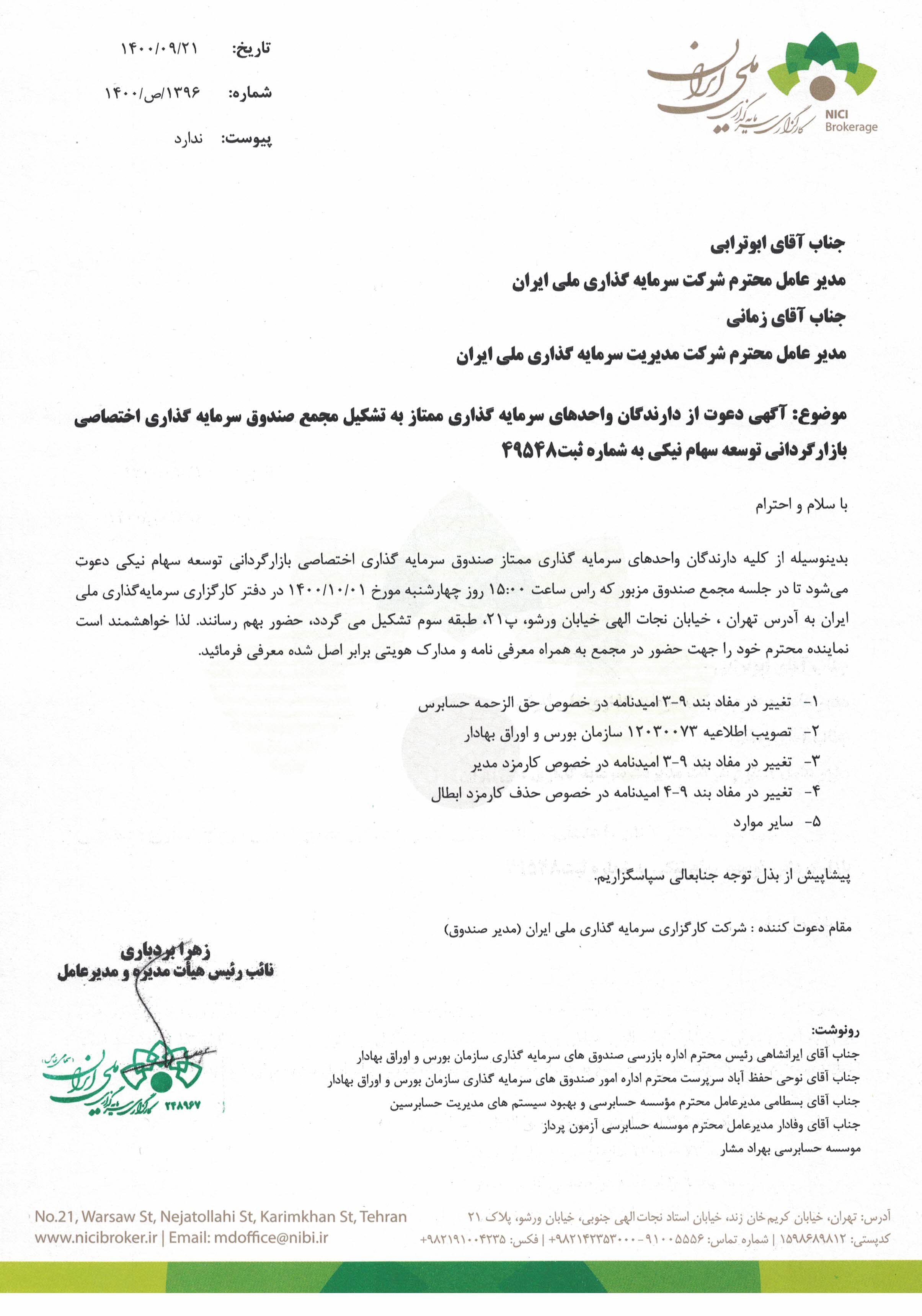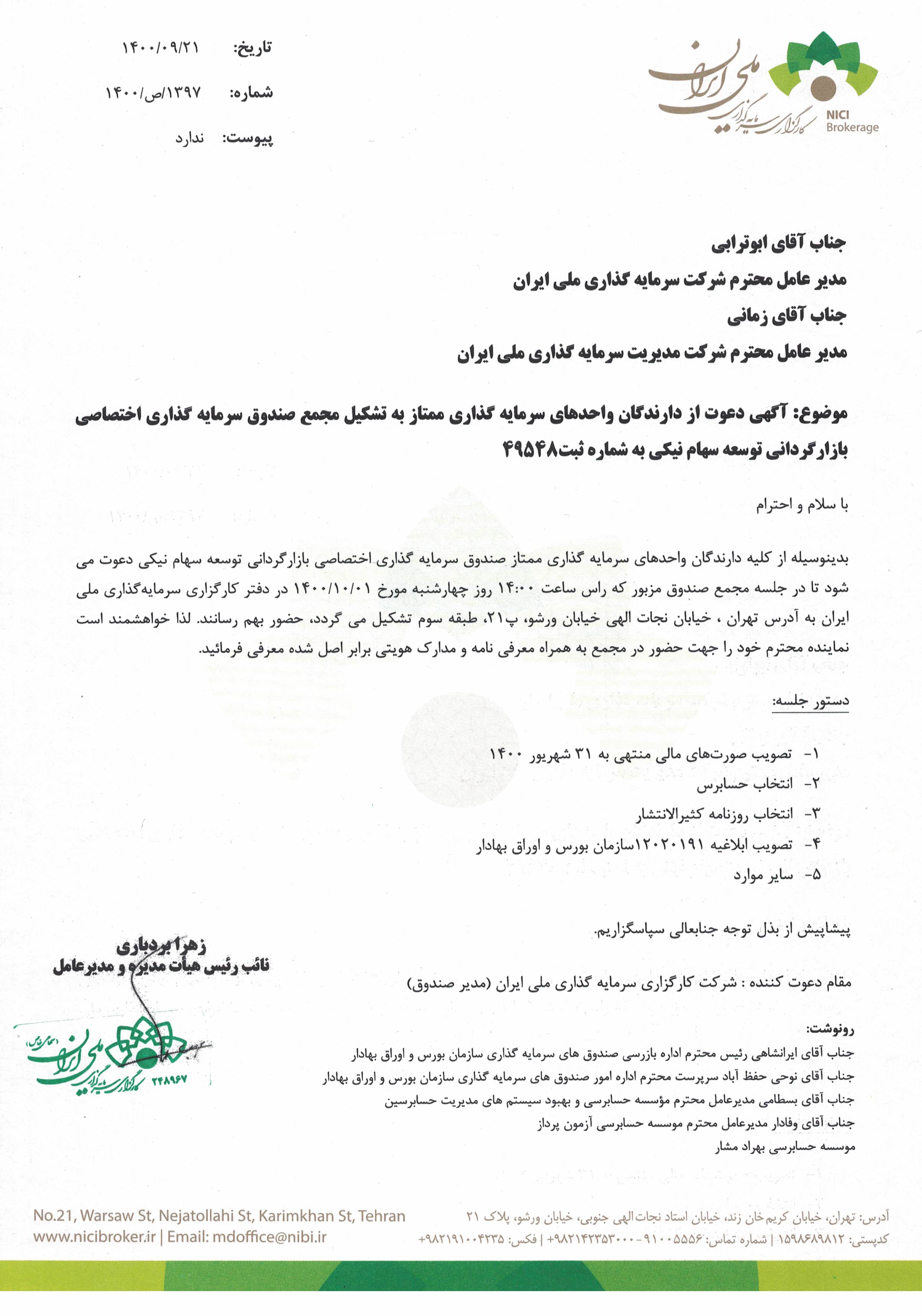 آگهی دعوت به مجمع صندوق سرمایه گذاری بازارگردانی توسعه سهام نیکی مورخ۱۴۰۰/۰۲/۲۲