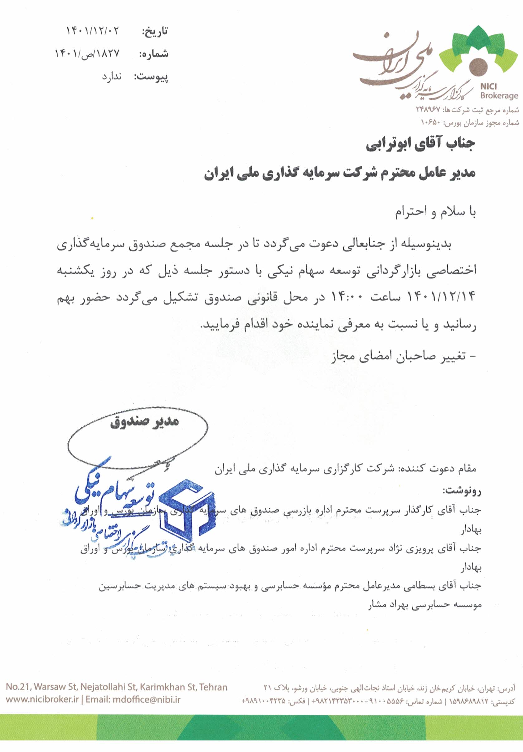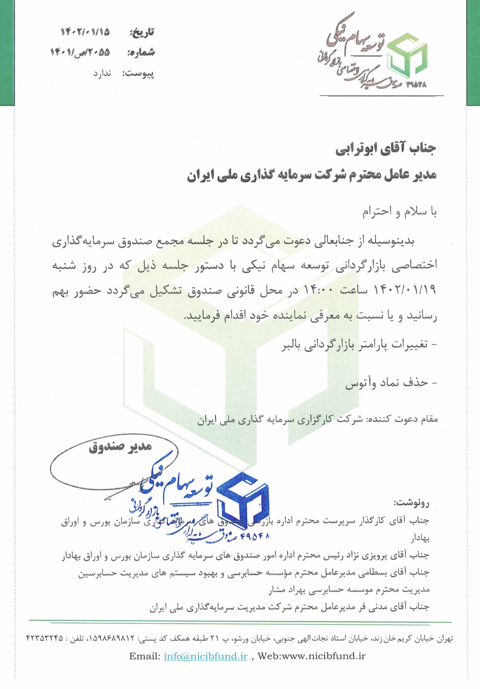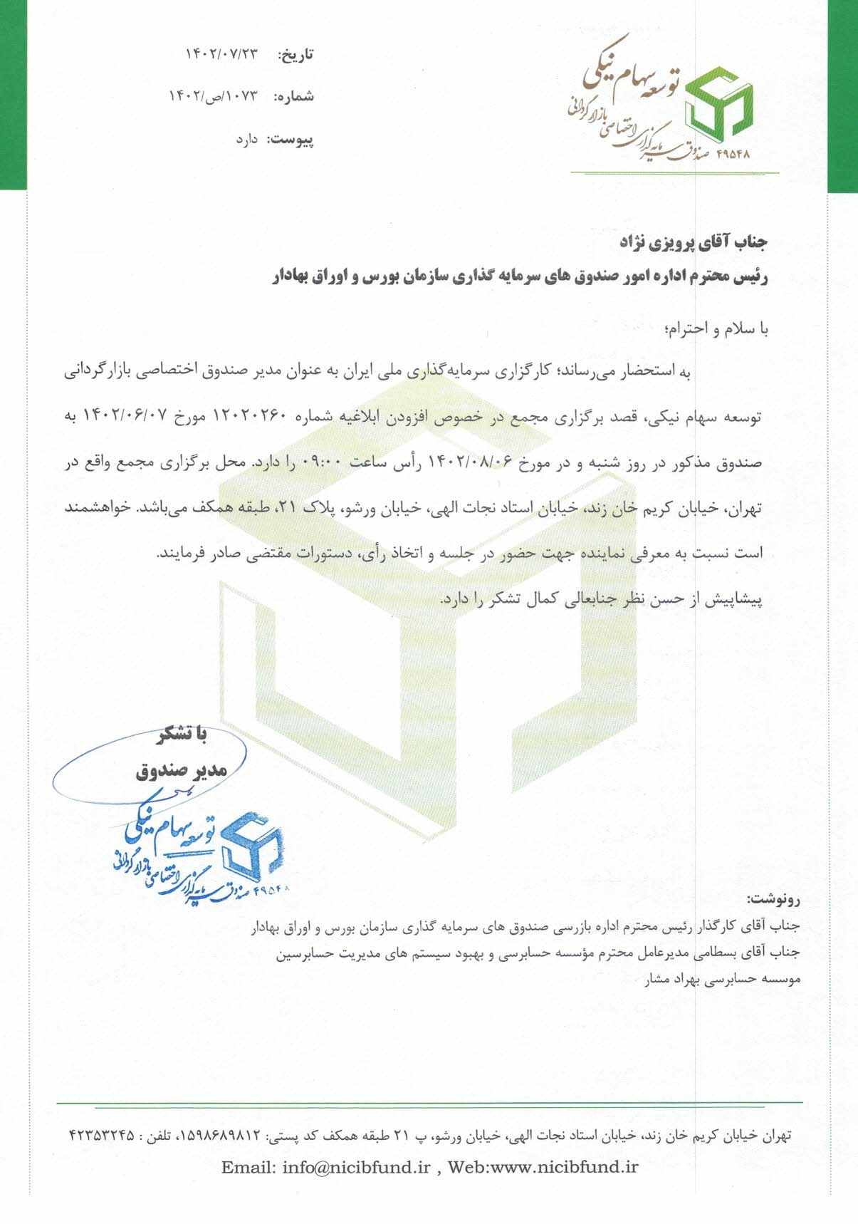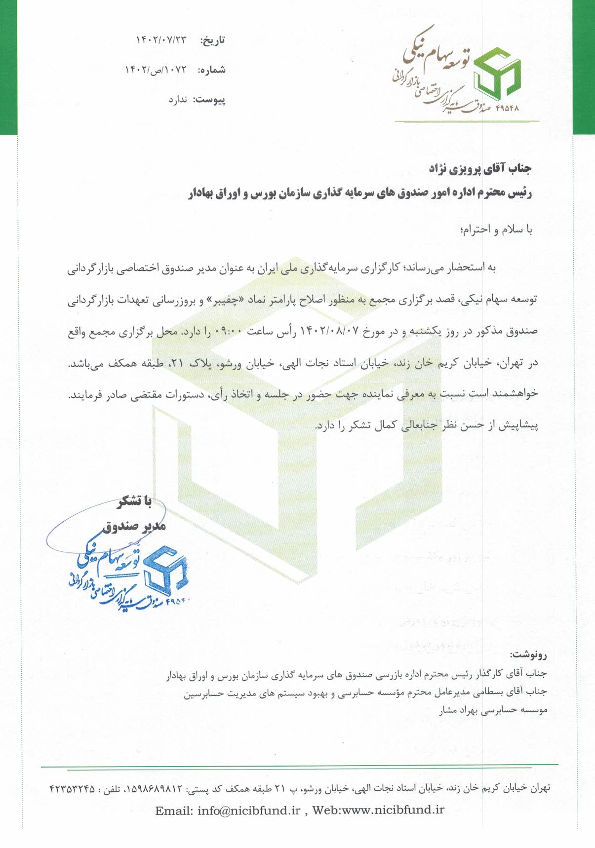 آگهی دعوت به مجمع صندوق سرمایه گذاری اختصاصی بازارگردانی توسعه سهام نیکی مورخه ۱۴۰۰/۰۲/۱