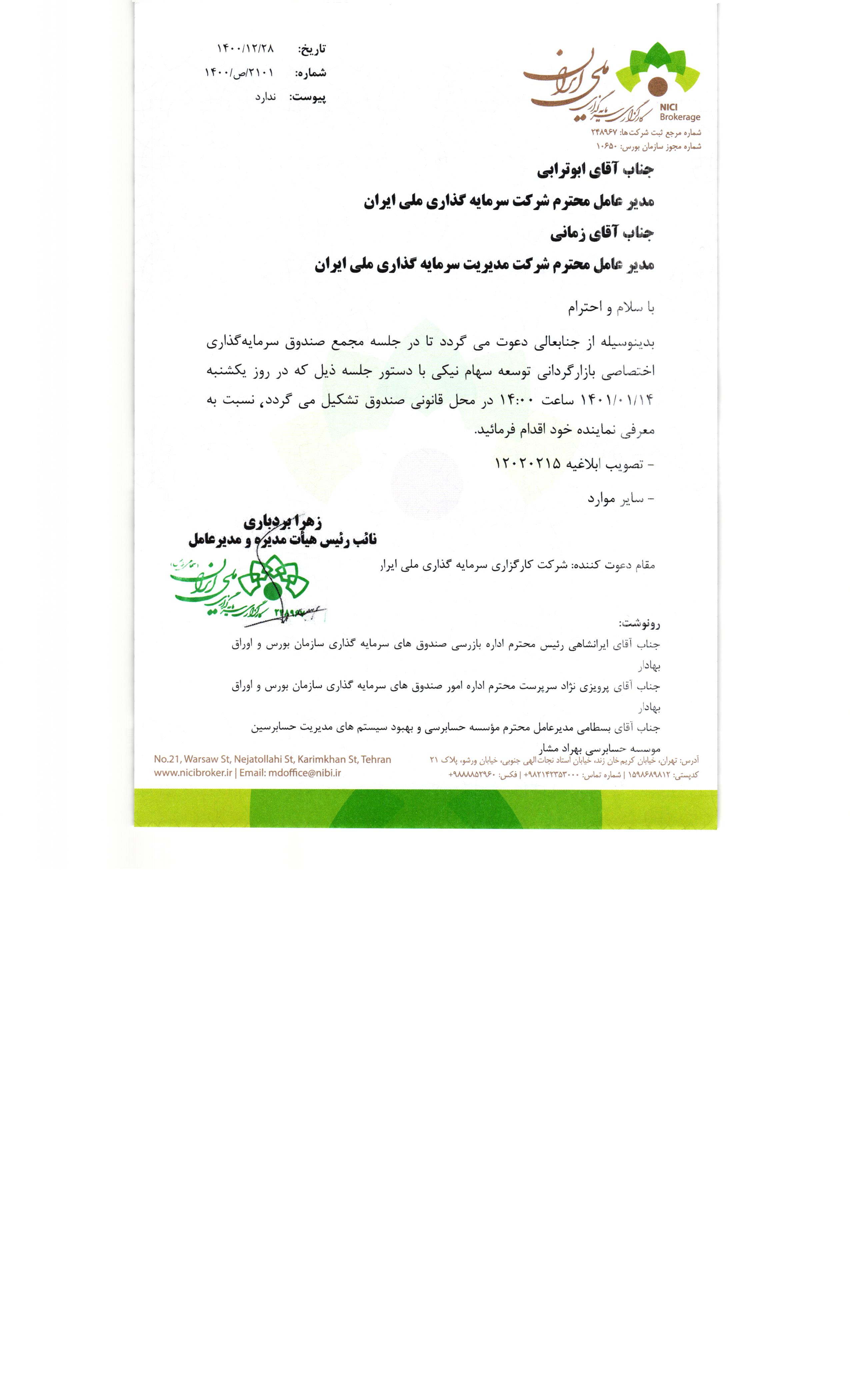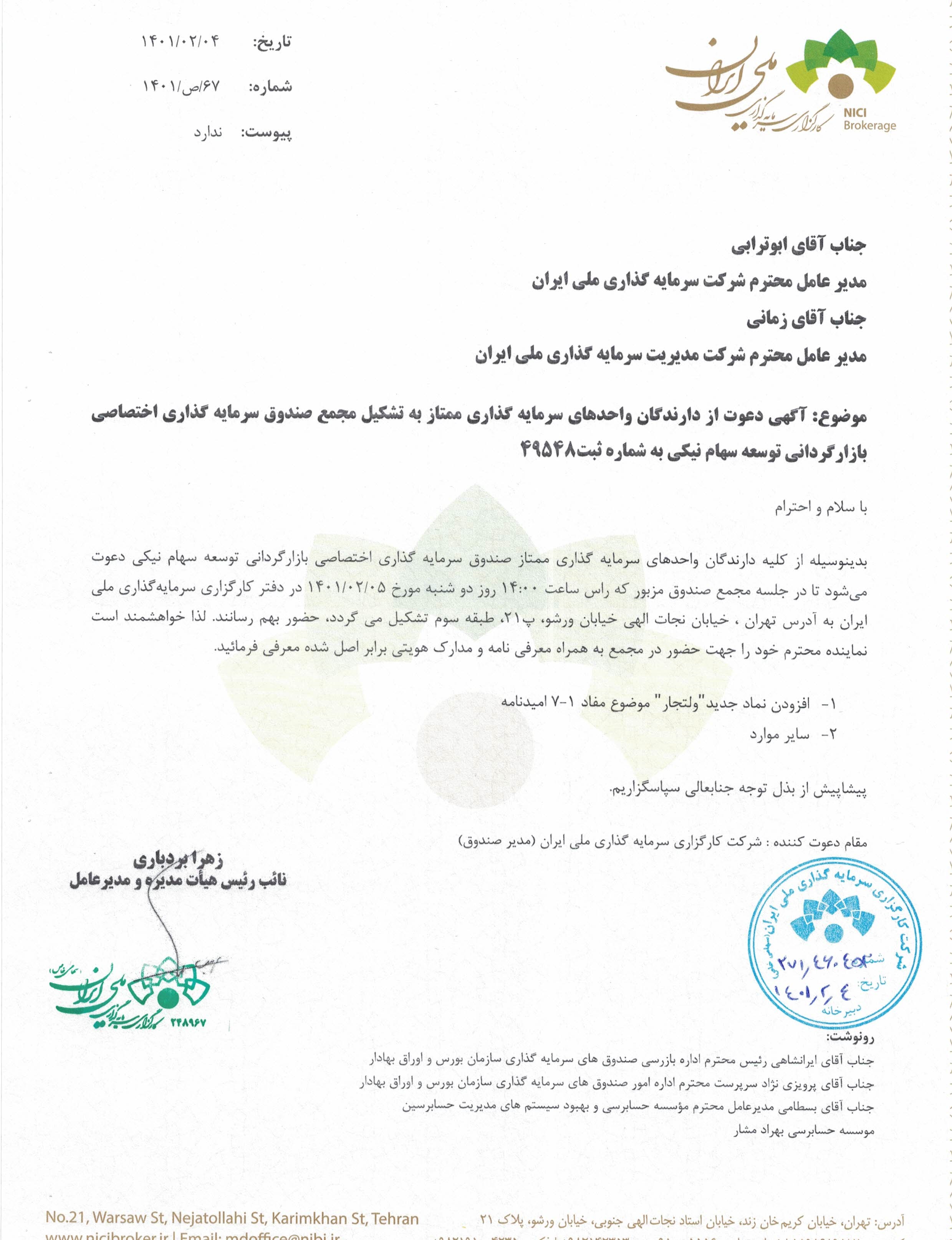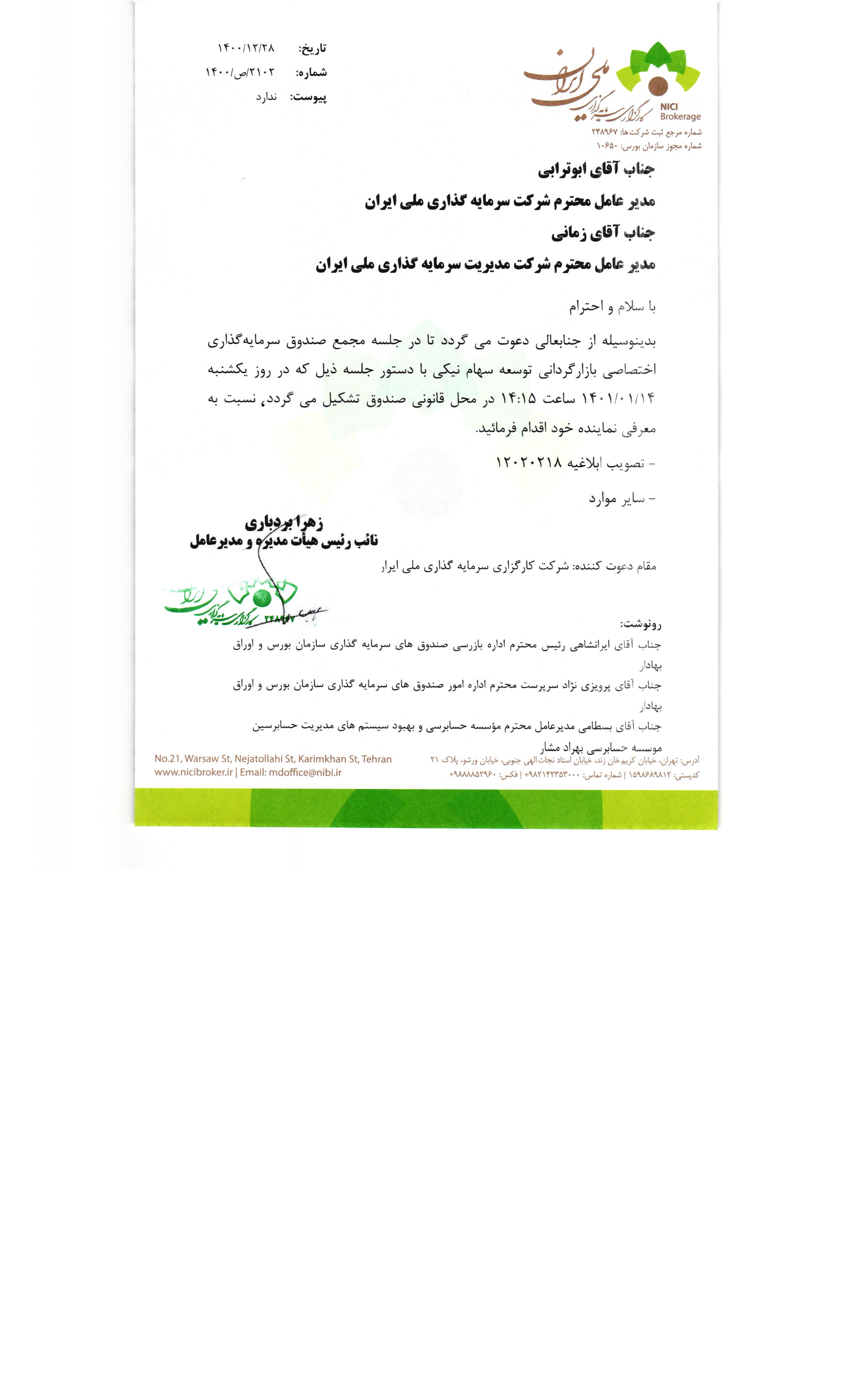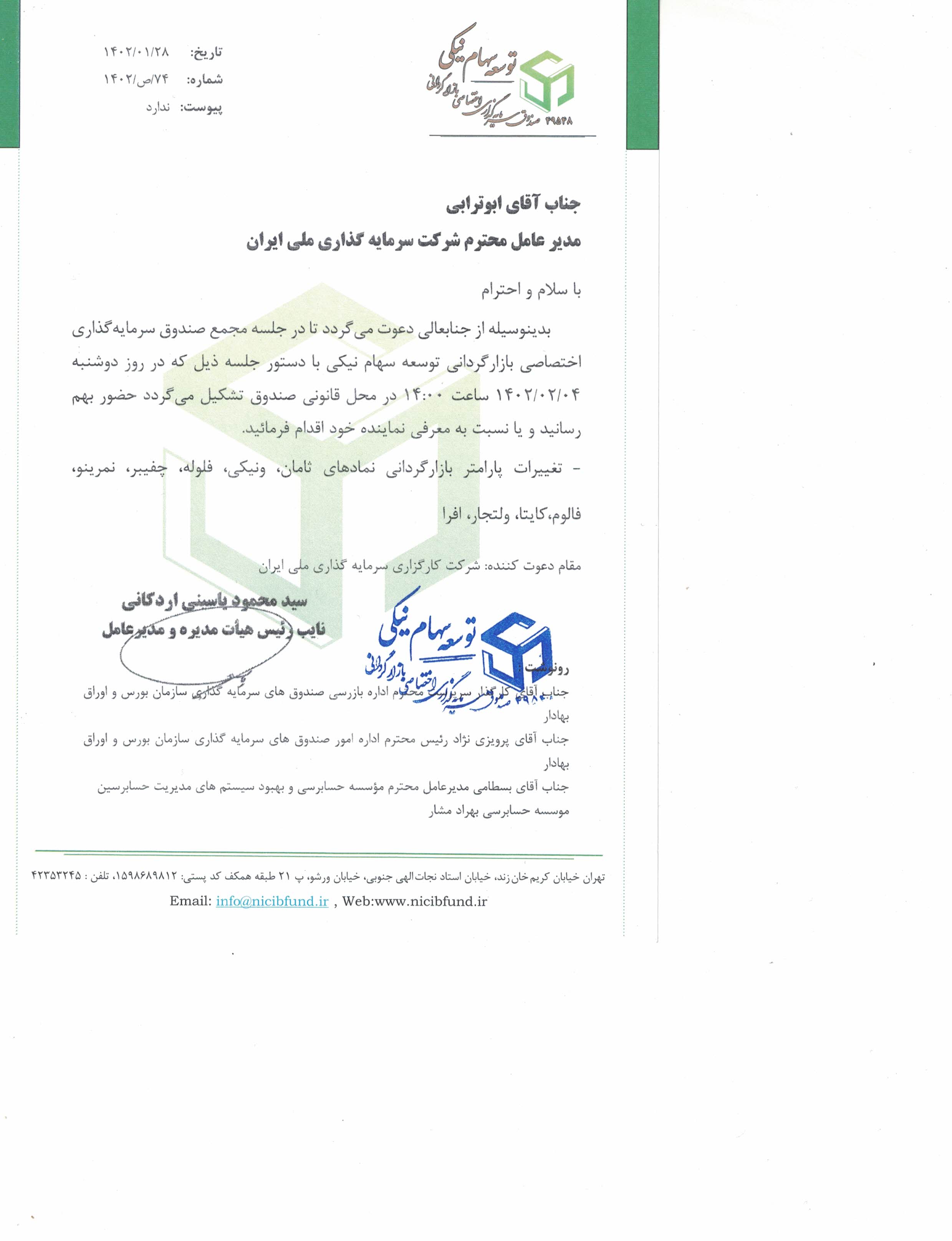 آگهی دعوت به مجمع صندوق سرمایه گذاری اختصاصی بازارگردانی توسعه سهام نیکی مورخه ۱۴۰۰/۰۲/۱