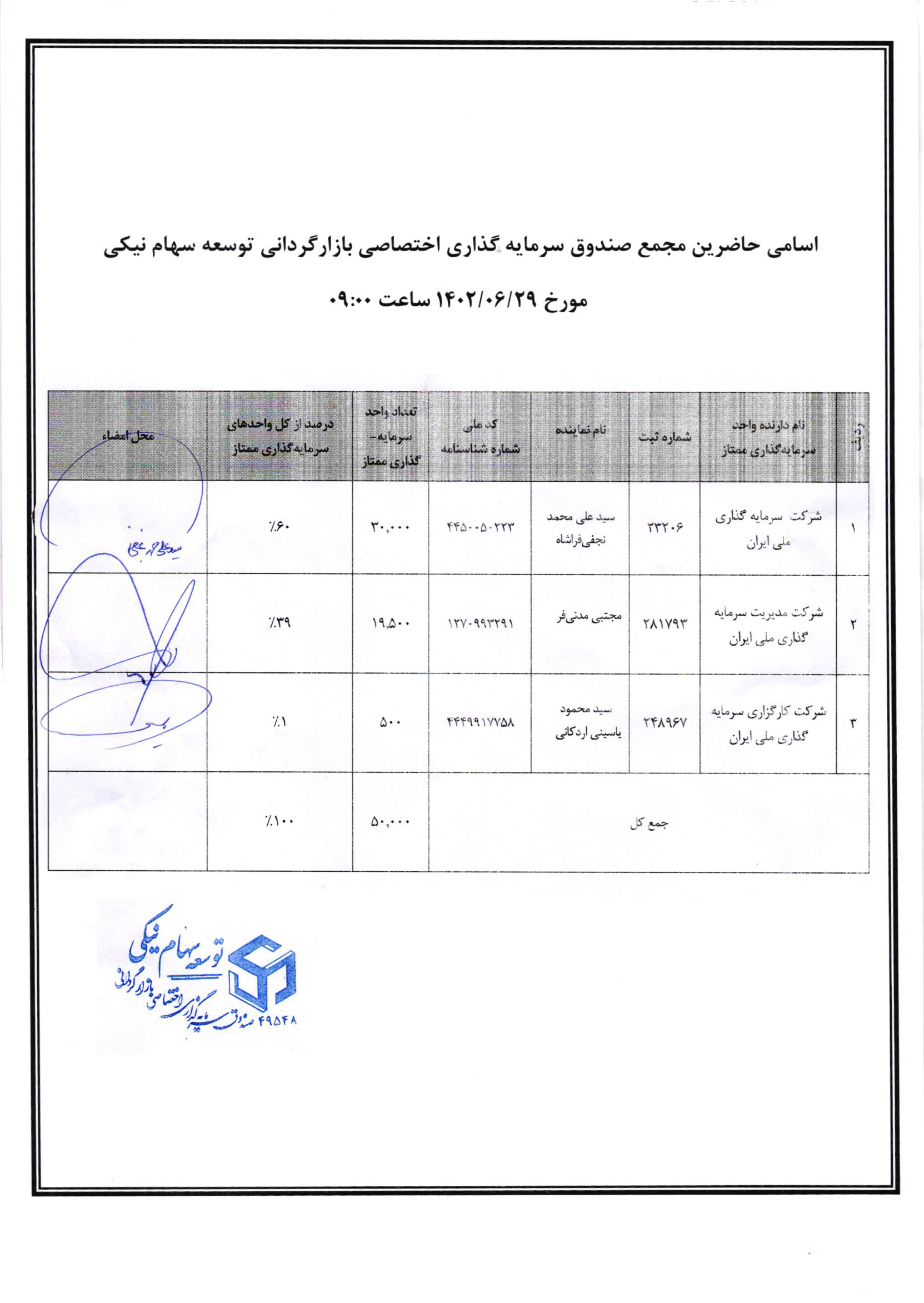 تصمیمات مجمع صندوق سرمایه گذاری اختصاصی بازارگردانی توسعه سهام نیکی مورخ ۱۳۹۹/۰۷/۰۹