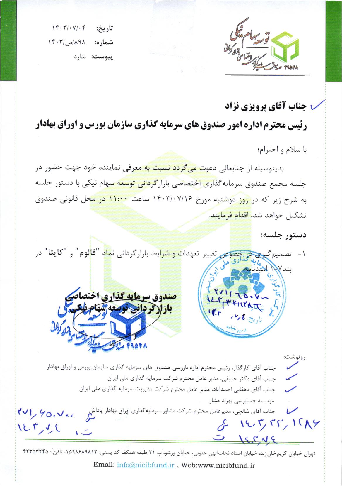 آگهی دعوت به مجمع صندوق سرمایه گذاری اختصاصی بازارگردانی توسعه سهام نیکی